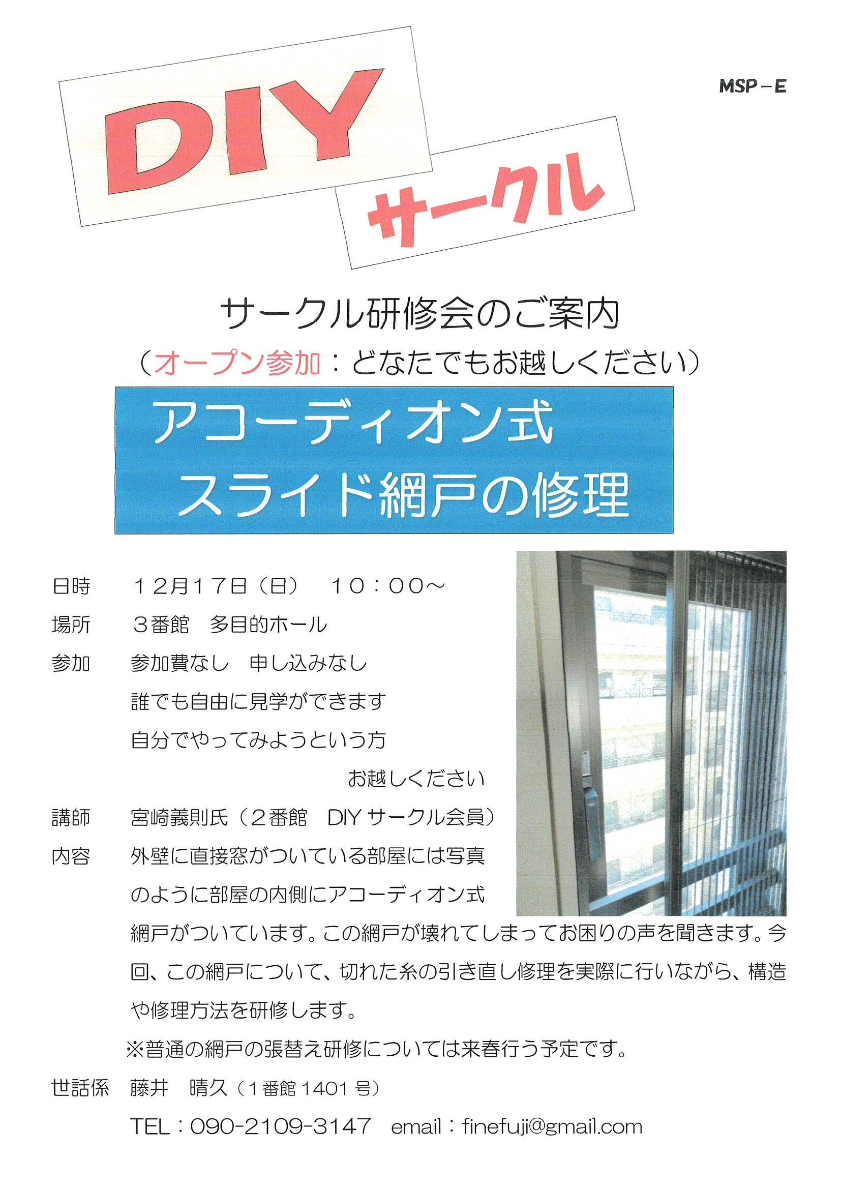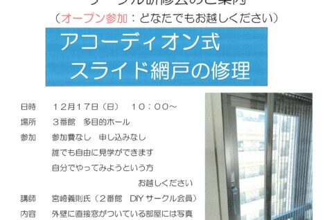 12月17日(日)DIYサークル(アコーディオン式スライド網戸の修理)
