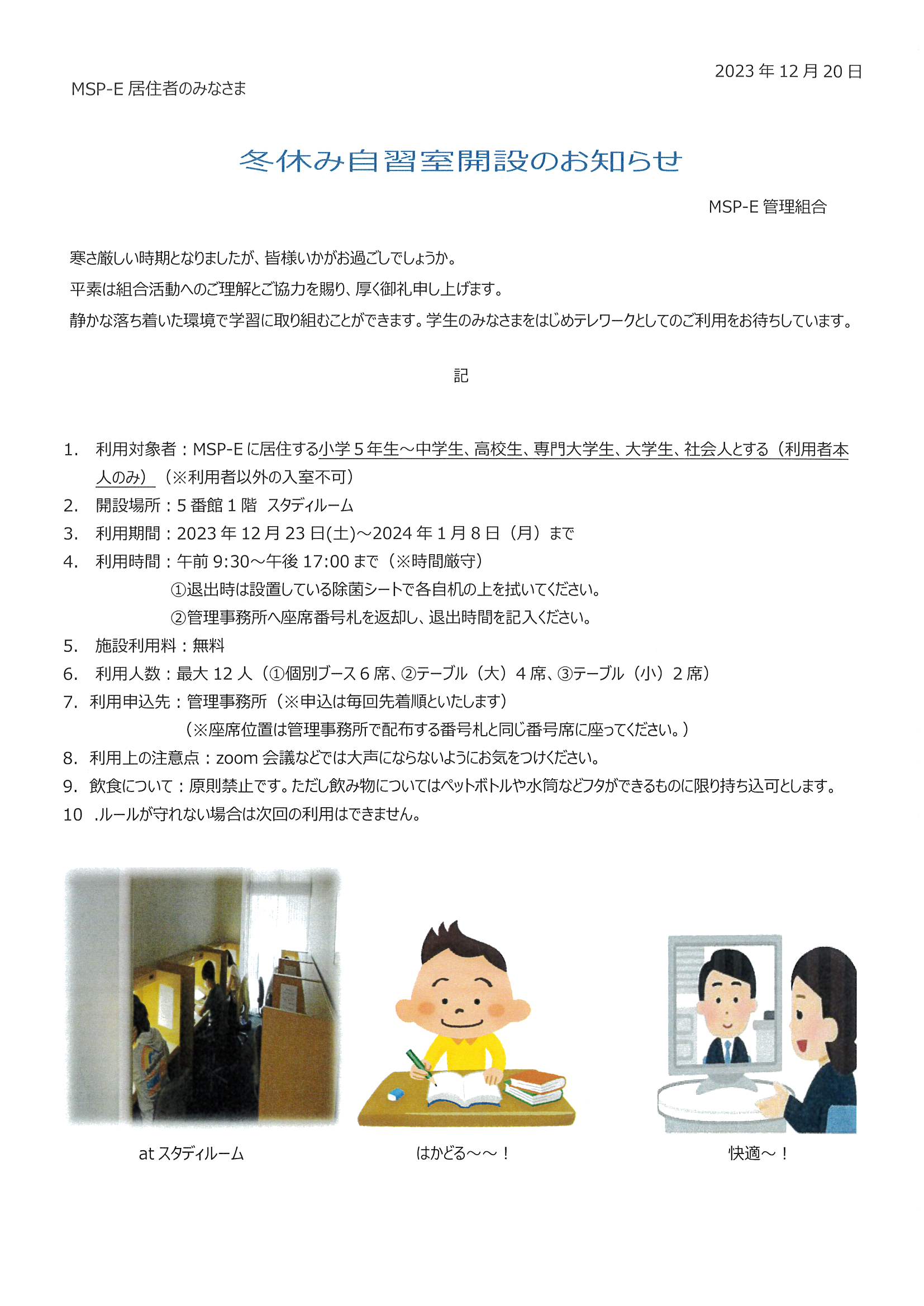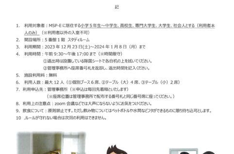 冬休み自習室開設のお知らせ 12/23~1/8(年末年始除く12/31~1/3)