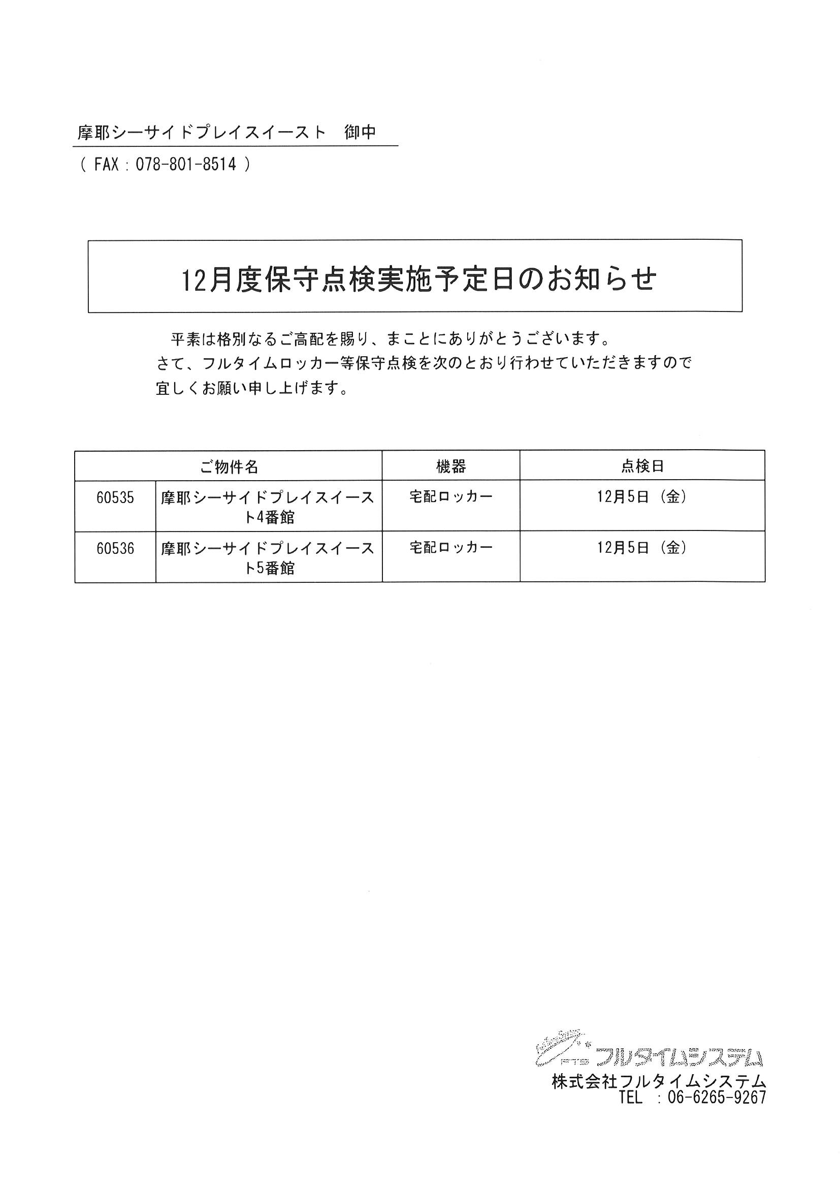 12月保守点検実施予定日のお知らせ