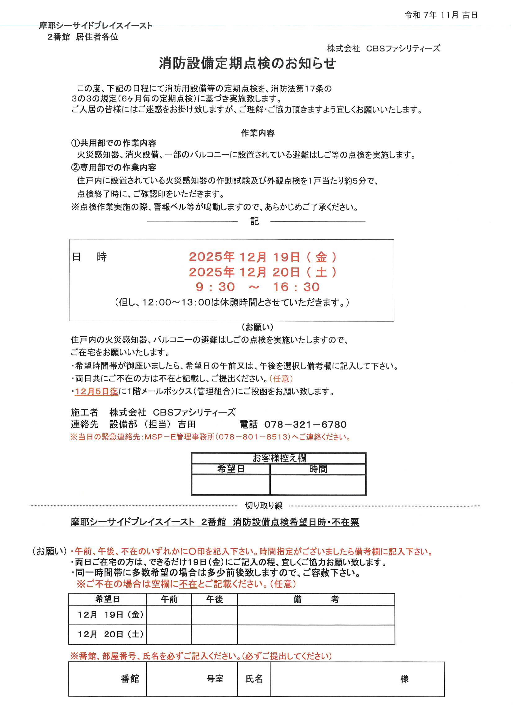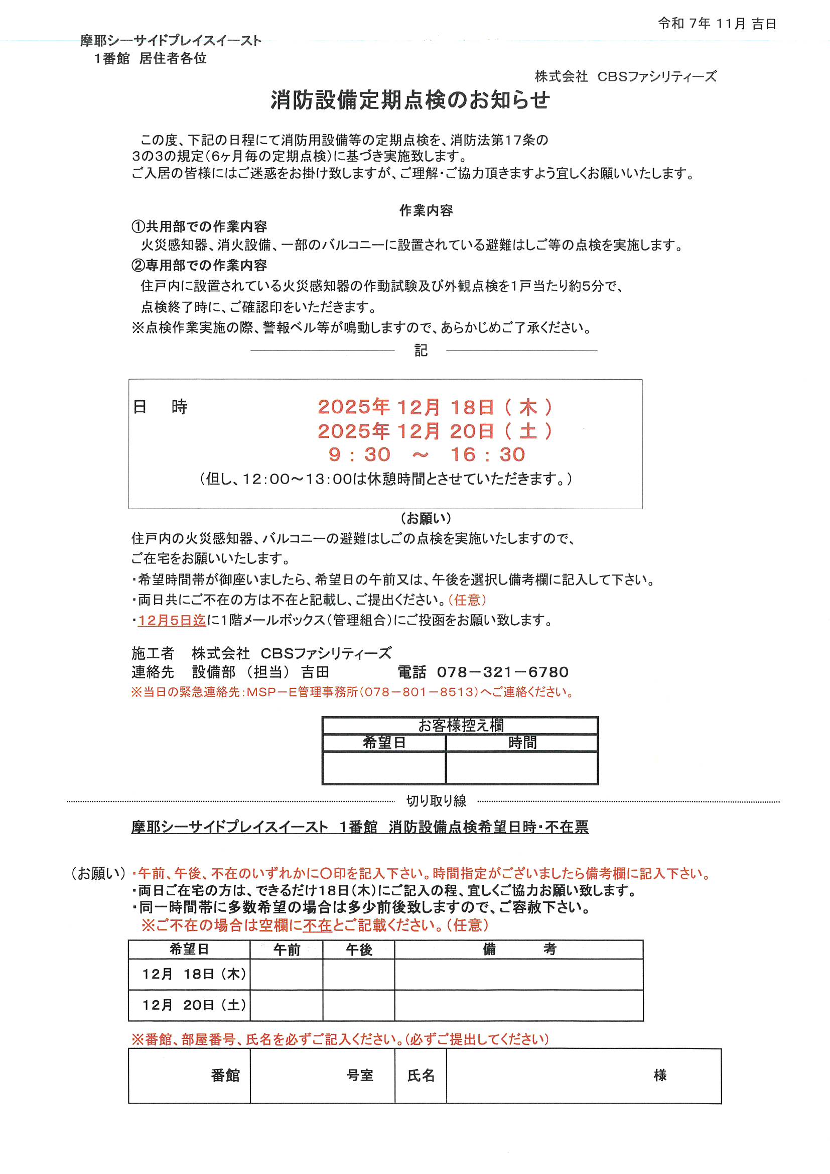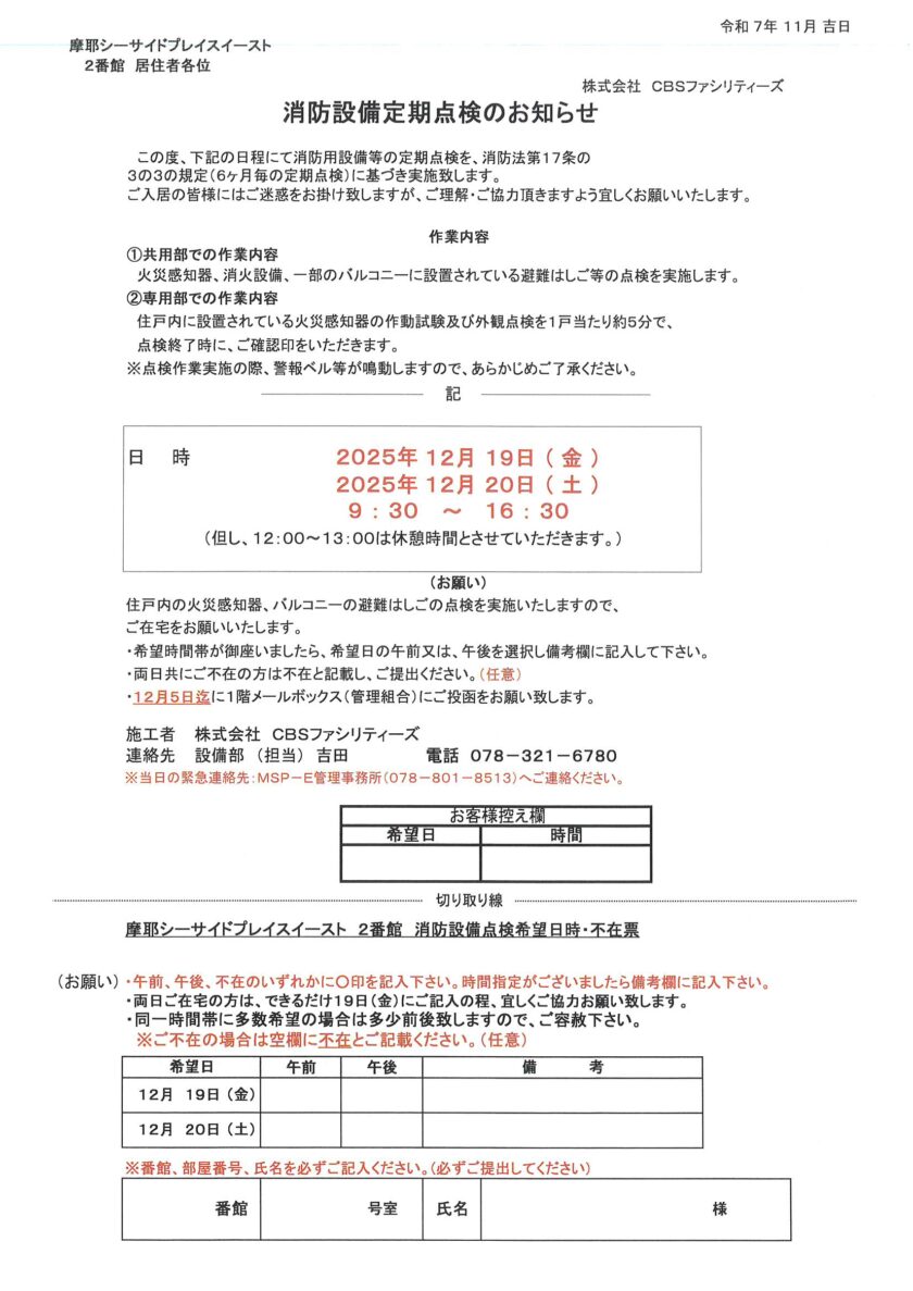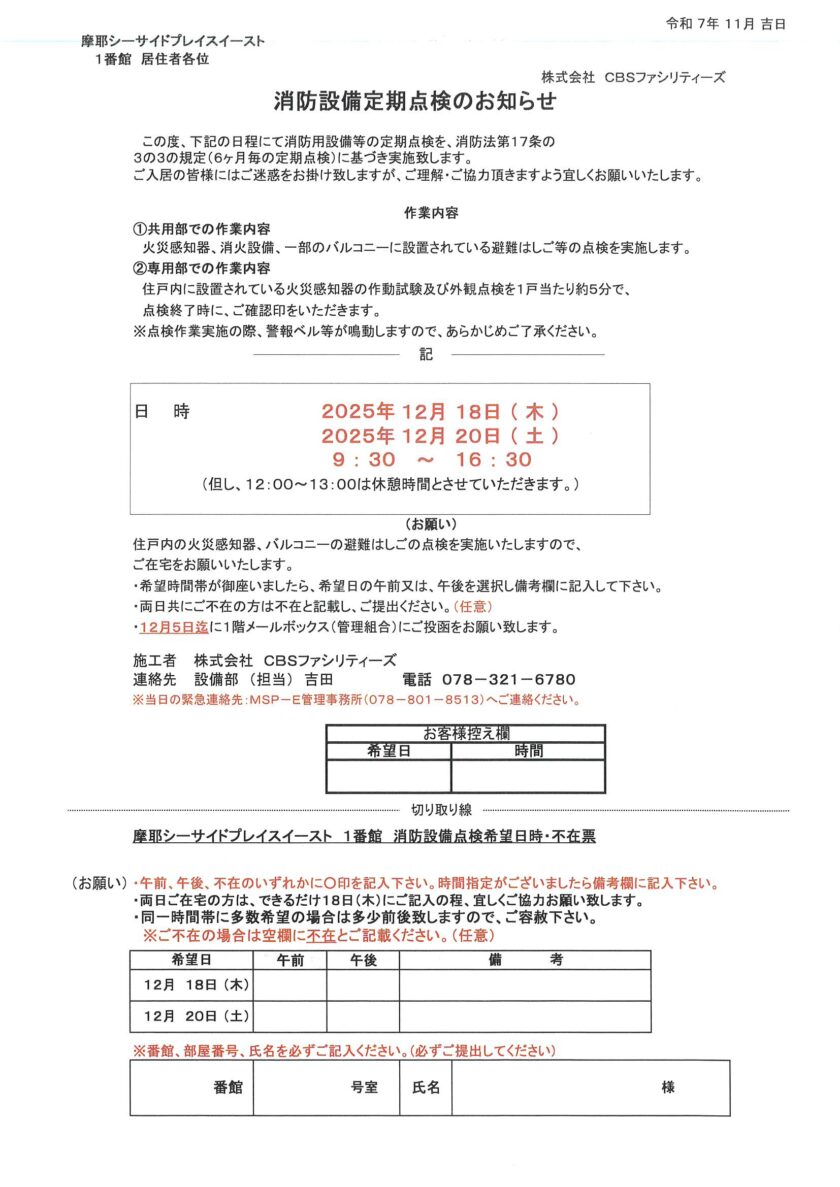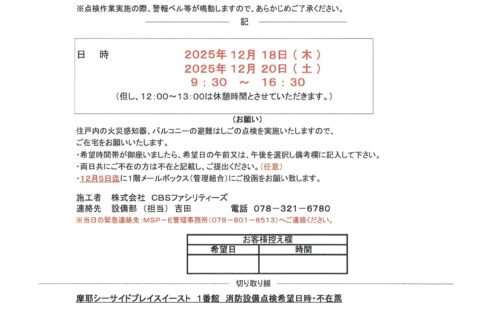 [1番館] 消防設備定期点検のお知らせ