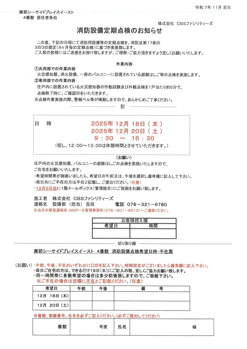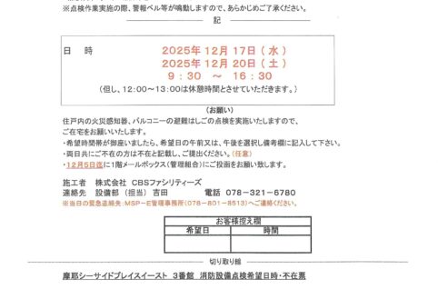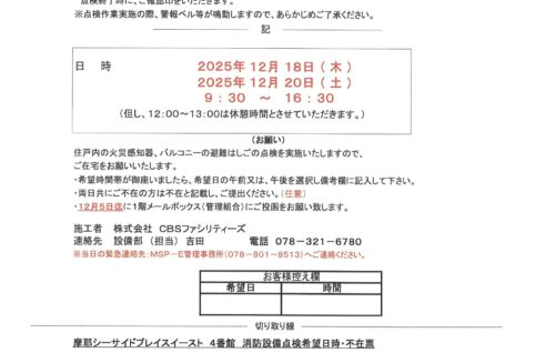 [4番館]消防設備定期点検のお知らせ