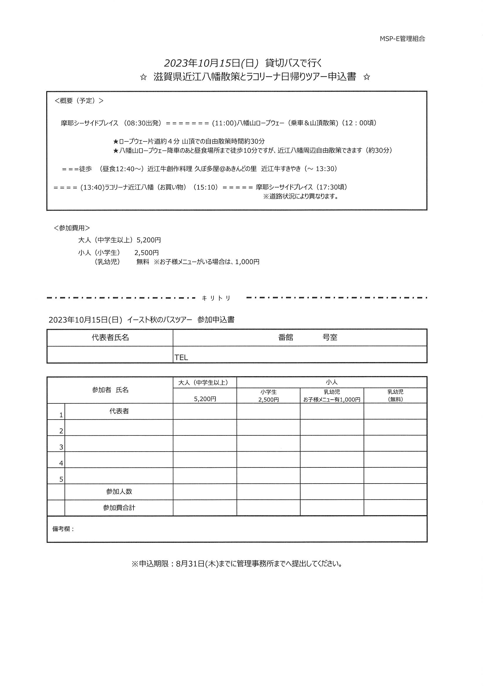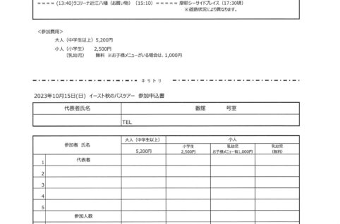 10/15(日)近江八幡日帰りバスツアー申込書。申込締切は8/31です。