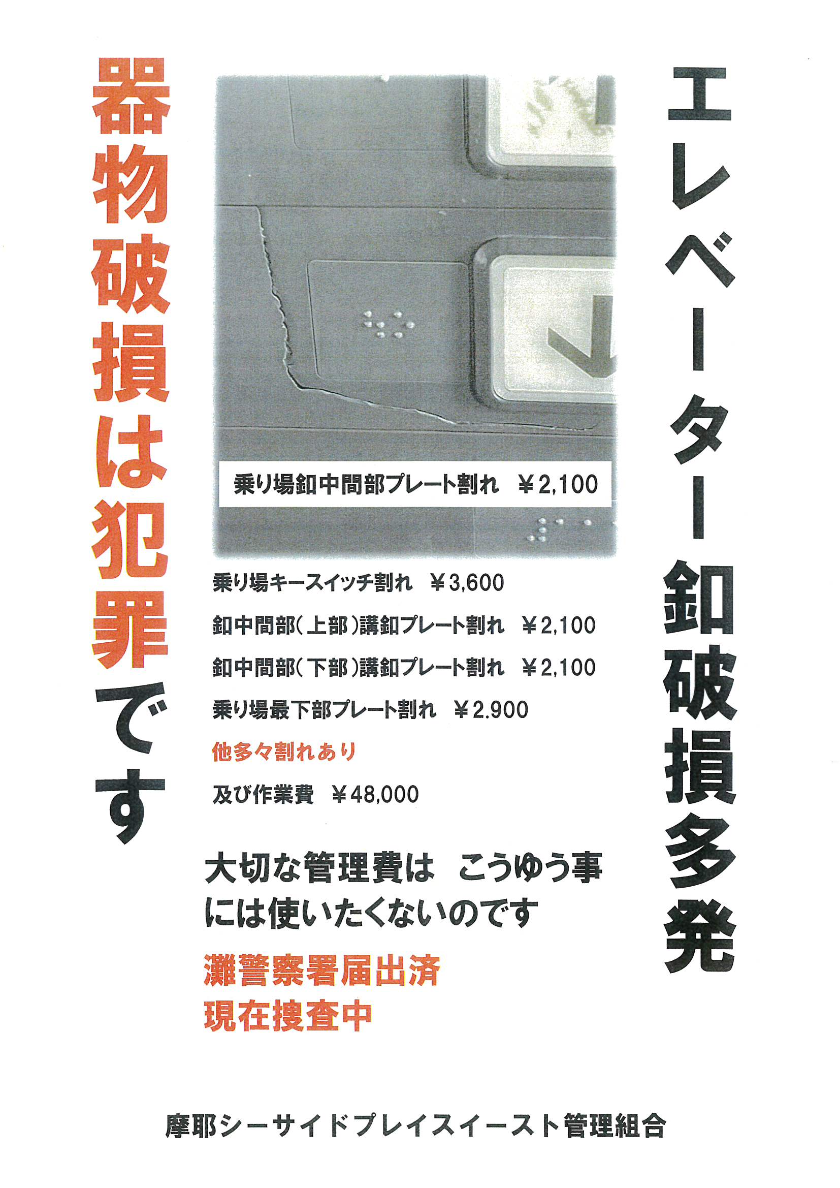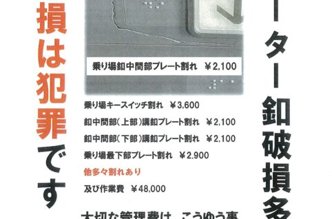 エレベーター釦破損多発 器物破損は犯罪です