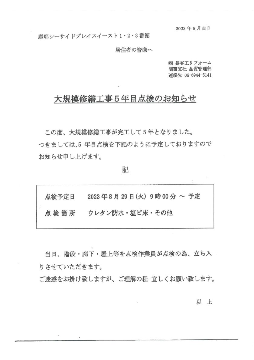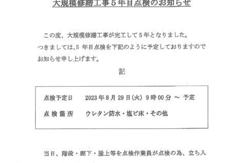 8月29日①②③番館大規模修繕工事5年目点検のお知らせ
