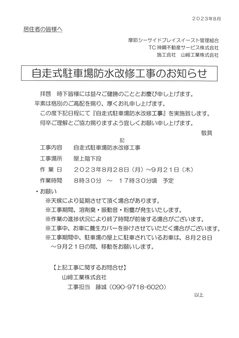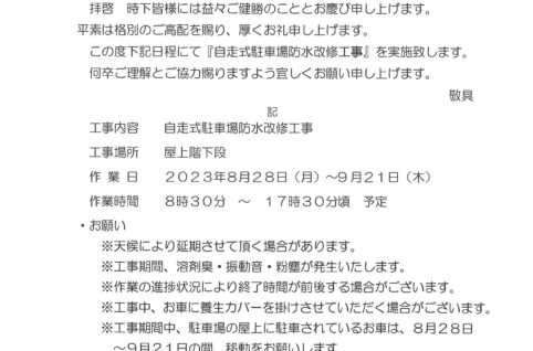 自走式駐車場防水改修工事のお知らせ