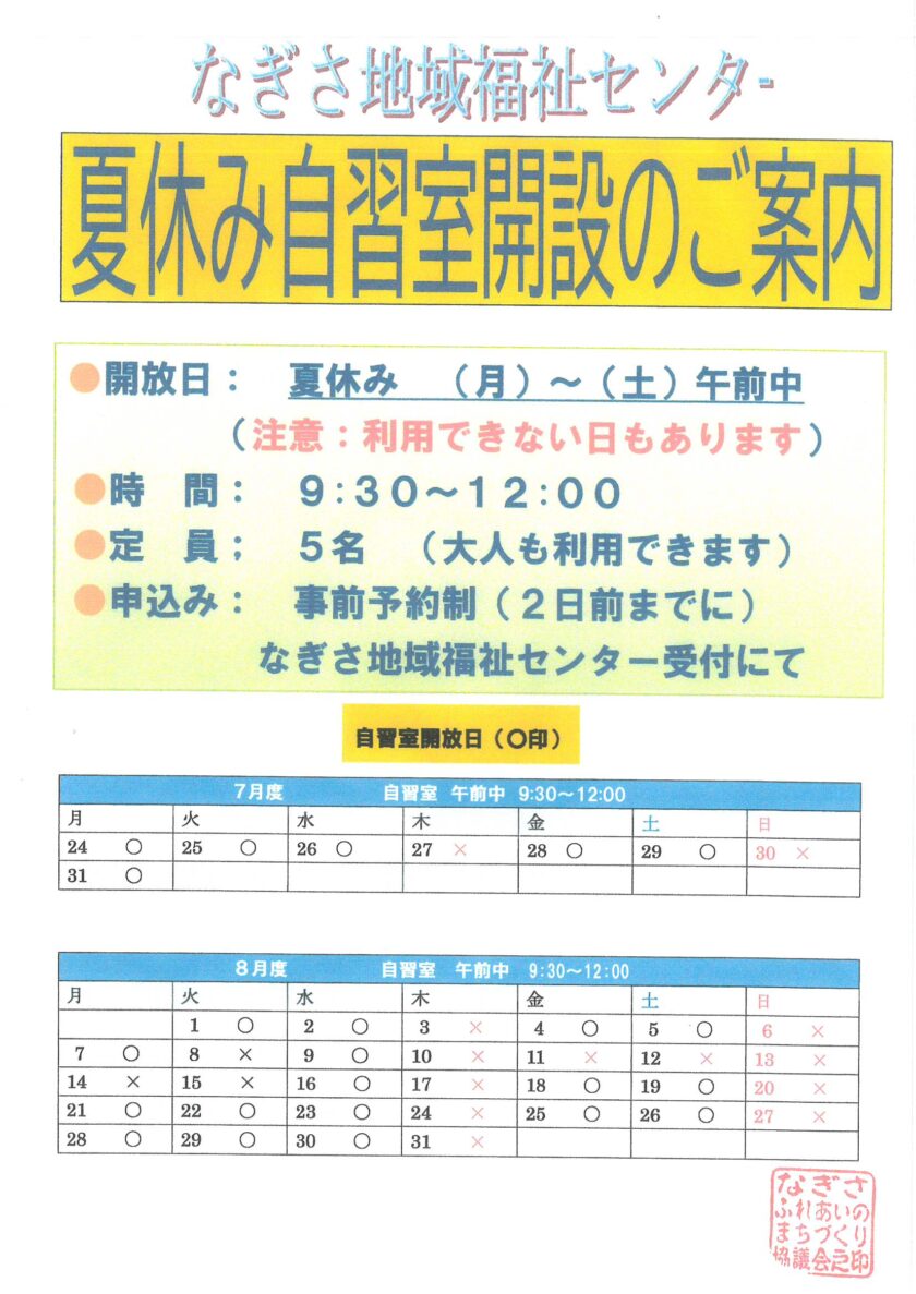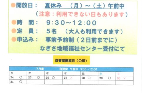 夏休み自習室開設のご案内(なぎさ地域福祉センター)