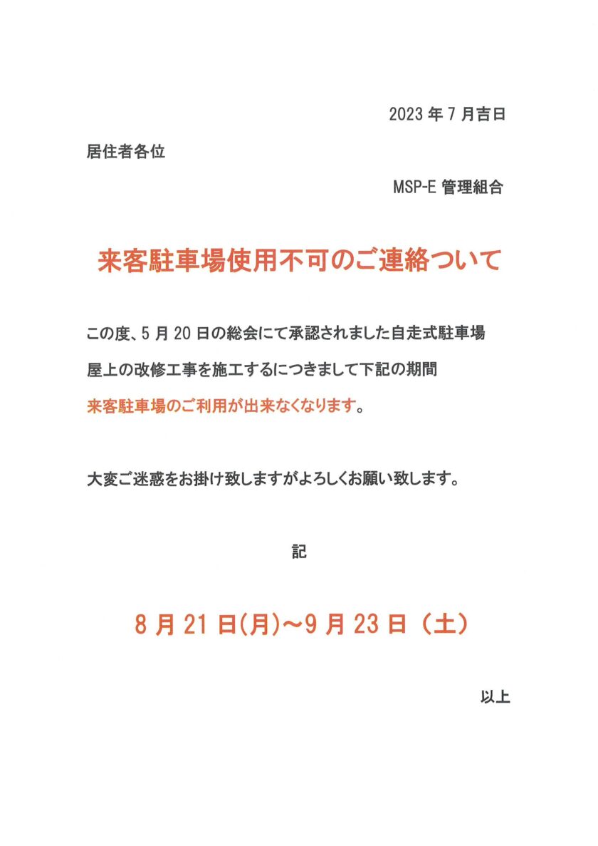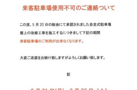 8/21~9/23自走式駐車場使用不可のご連絡について