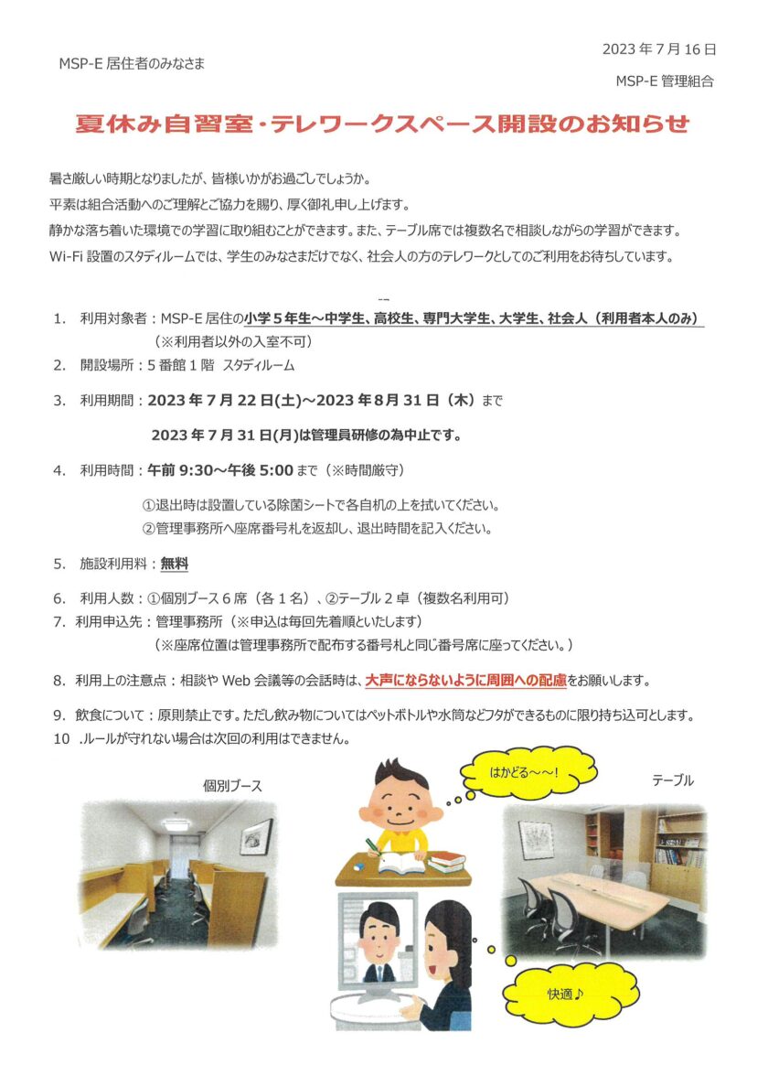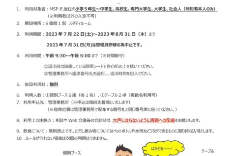 7/22~8/31夏休み自習室・テレワークスペース開設のお知らせ