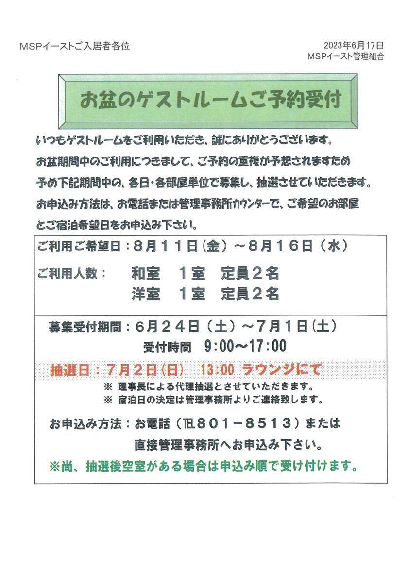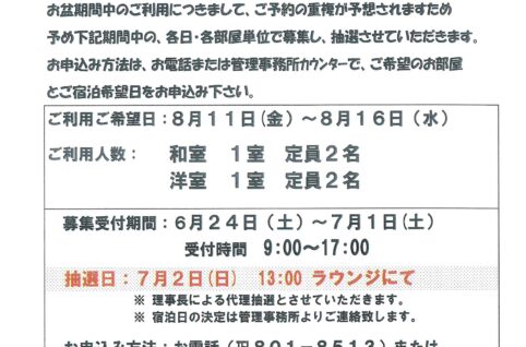 お盆ゲストルームご予約受付6/24~7/1