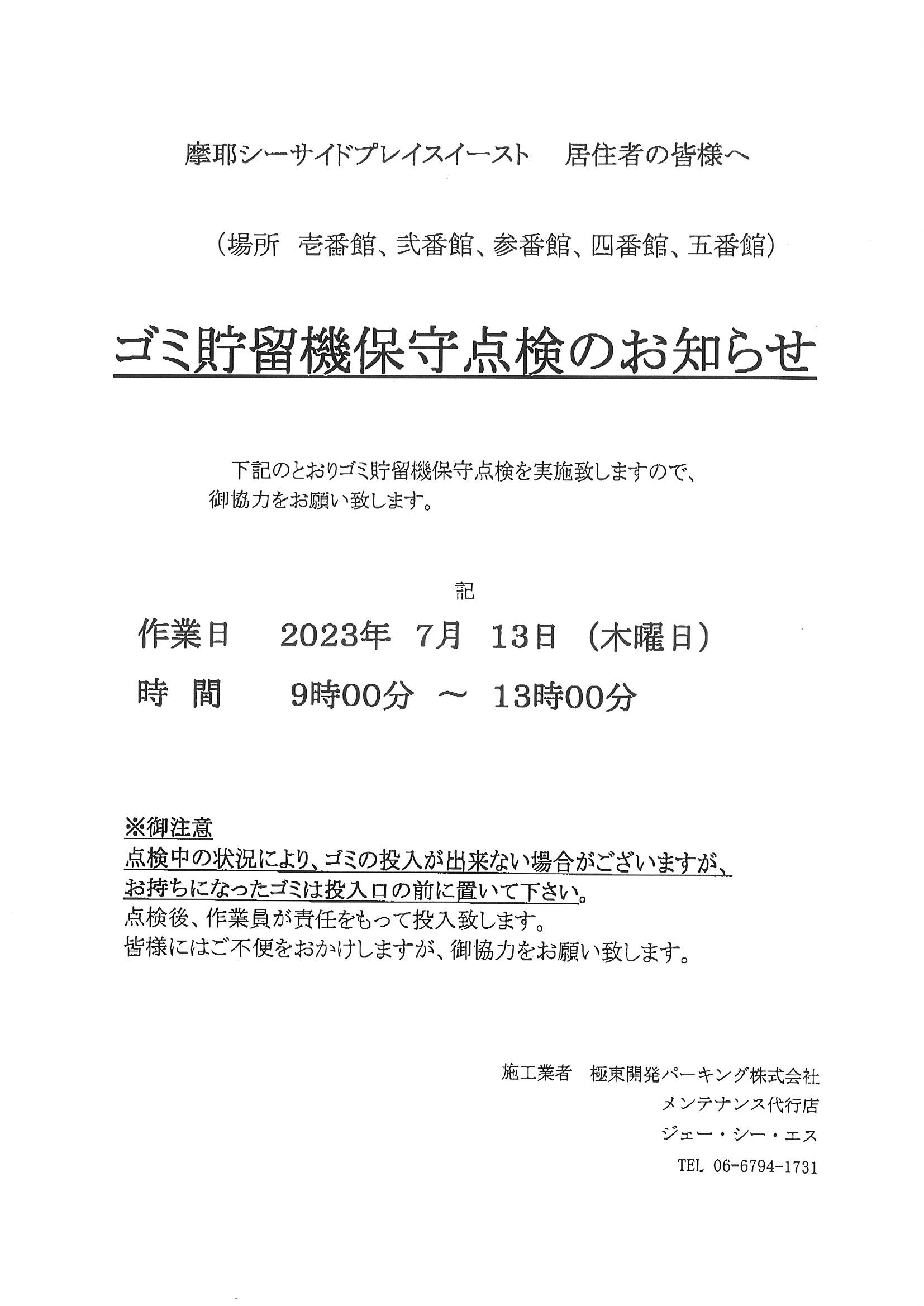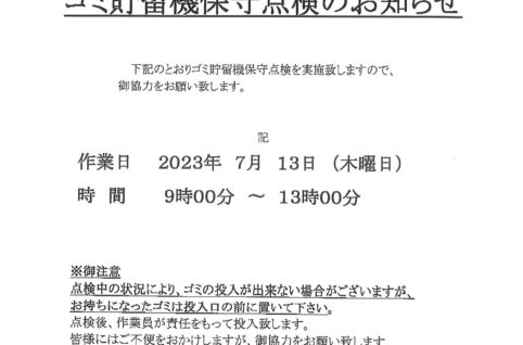7/13 ゴミ貯留機保守点検のお知らせ