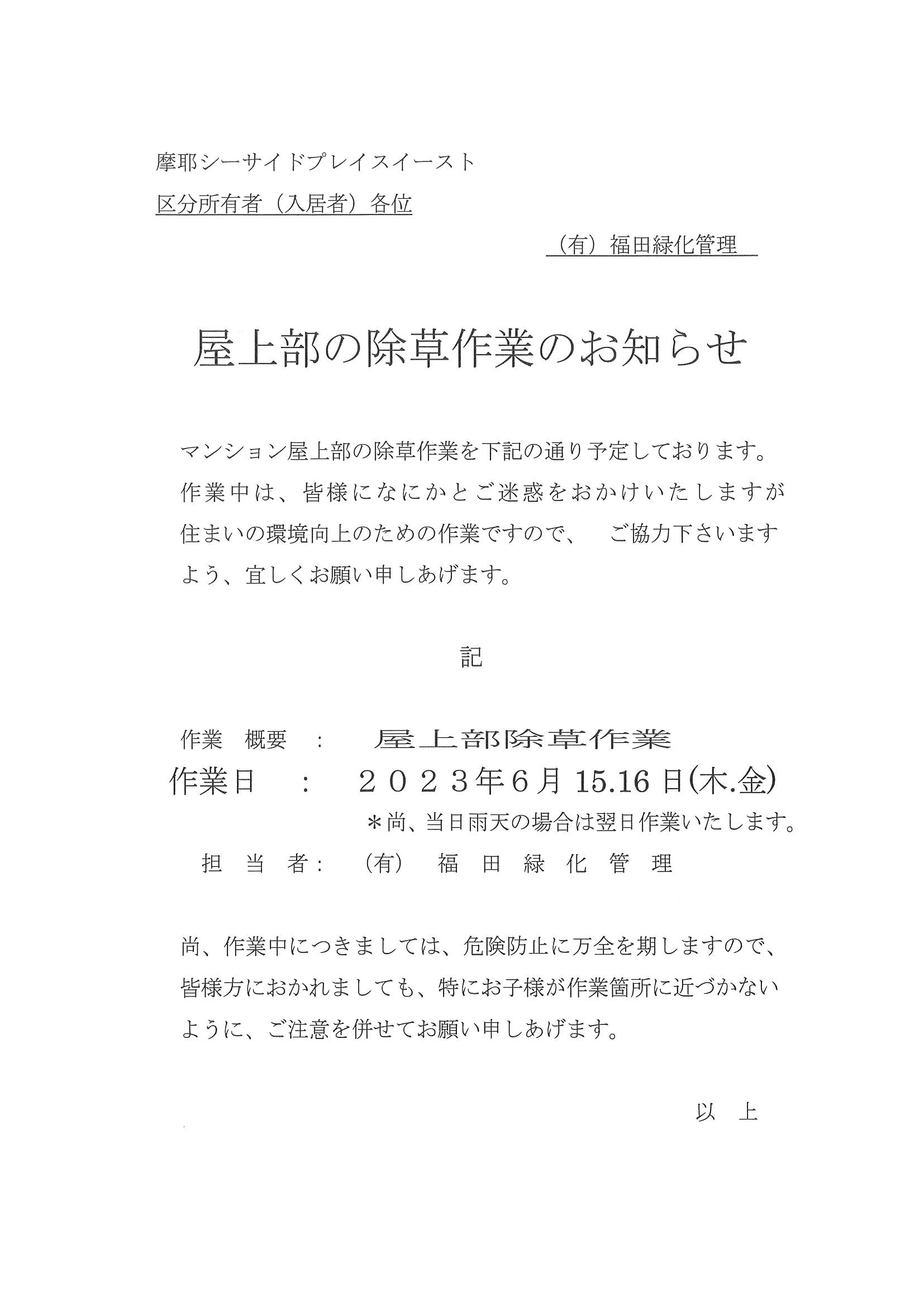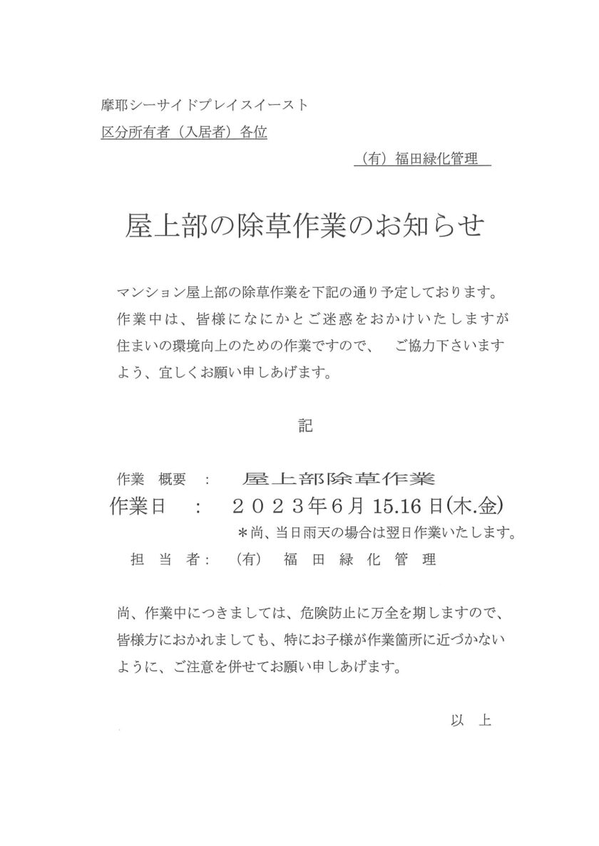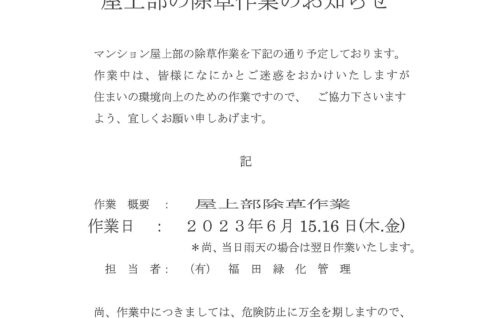 6/15(木)・16(金)屋上部の除草作業のお知らせ