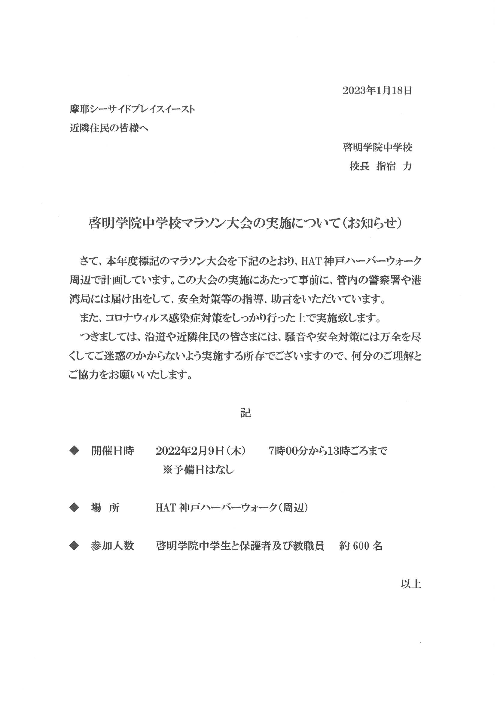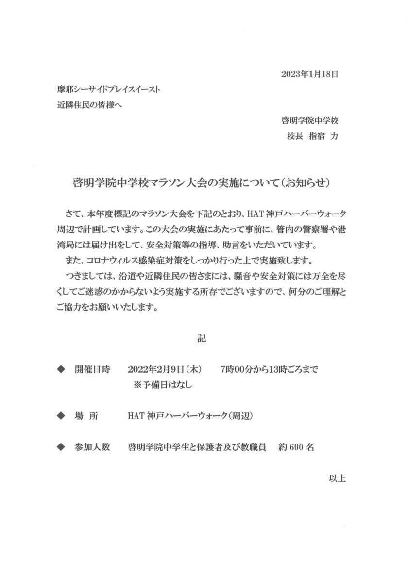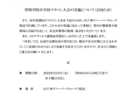 2月9日啓明学院中学校マラソン大会の実施について