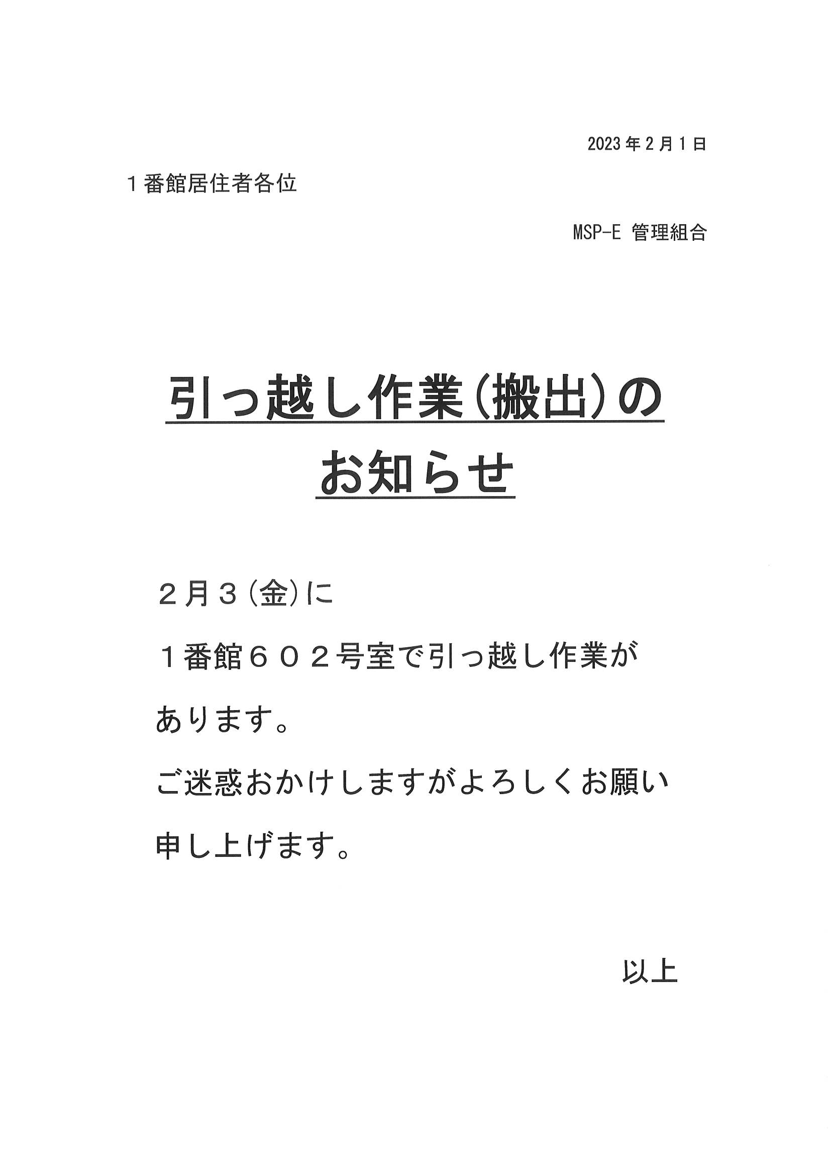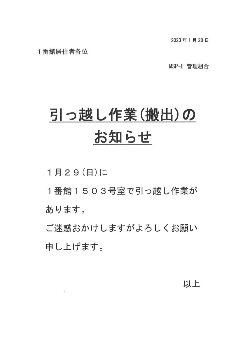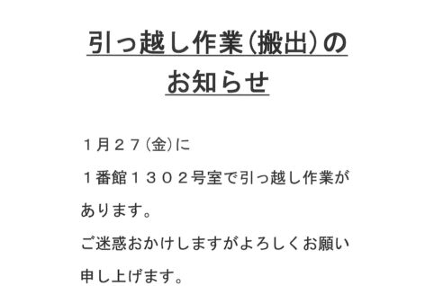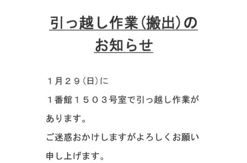 [1番館]引っ越し作業(搬出)のお知らせ
