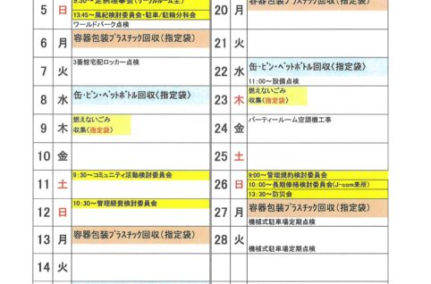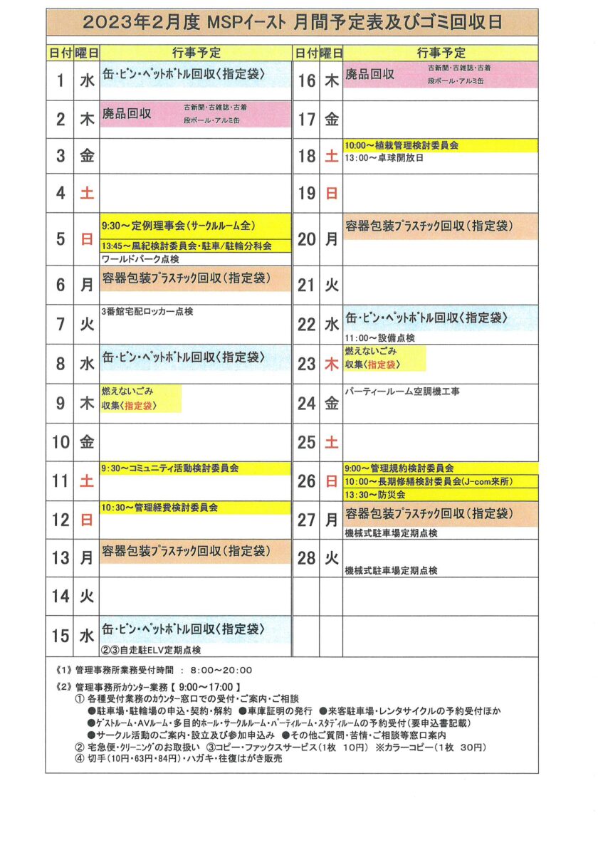 2023年2月度MSP-E月間予定表及びゴミ回収日