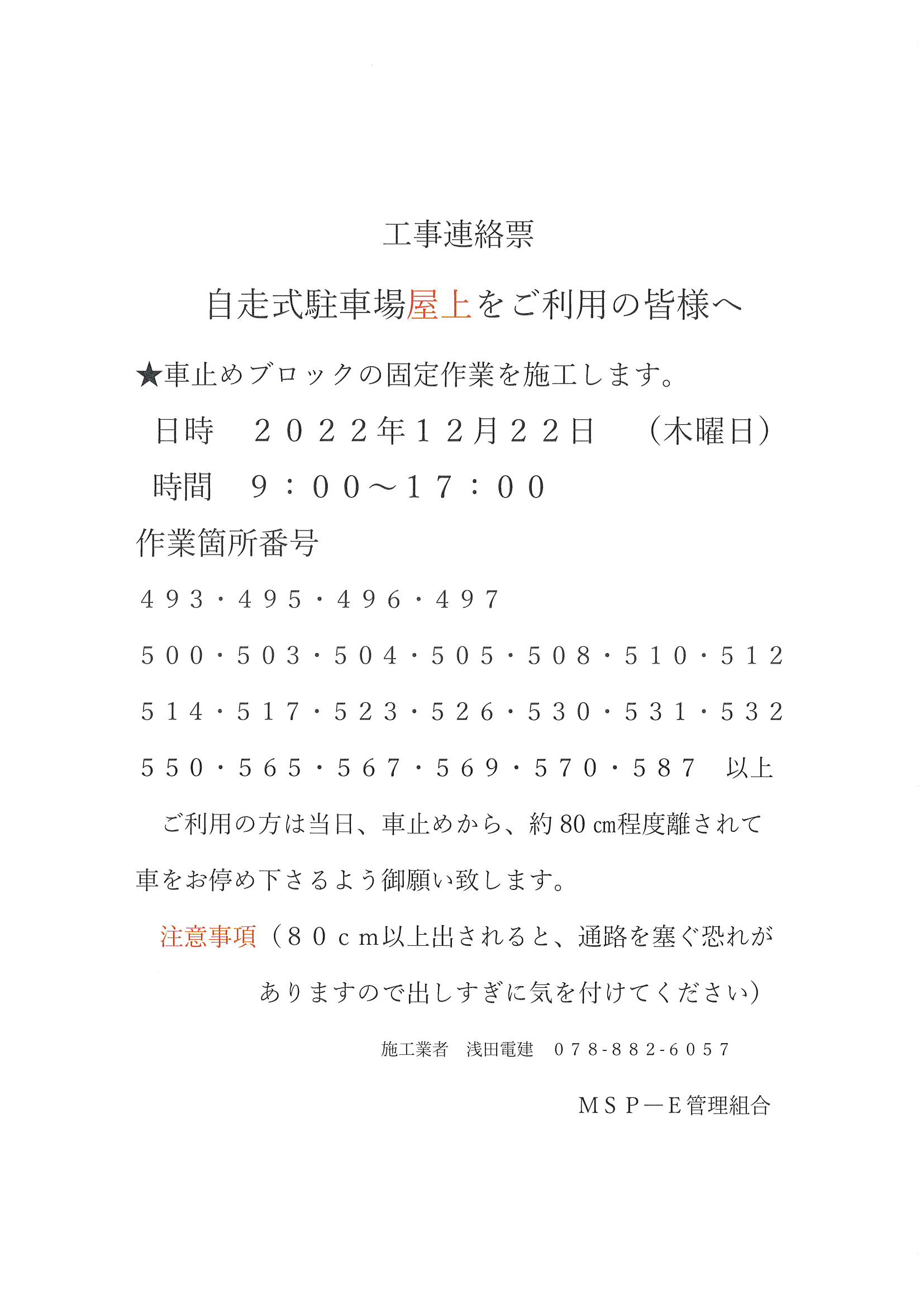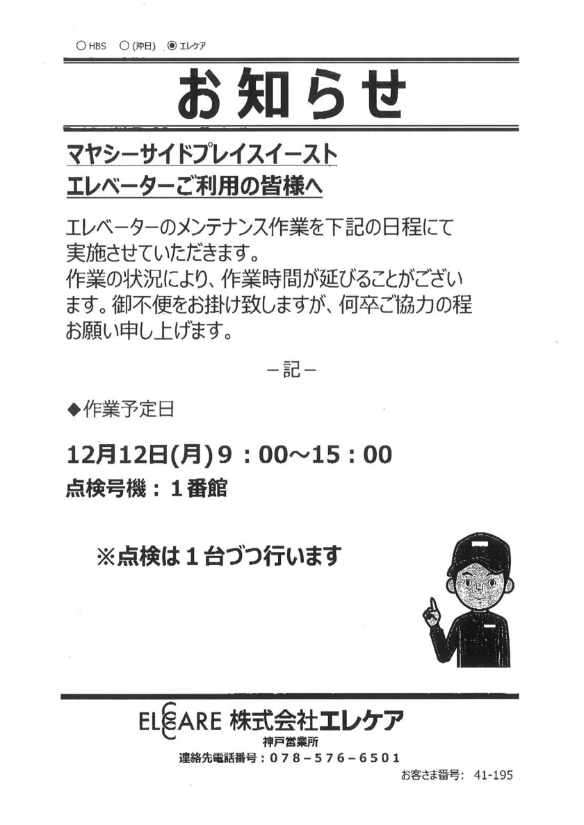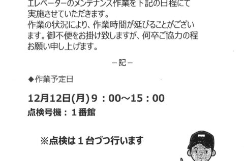 4番館ELV点検12/12(月)9:00~15:00