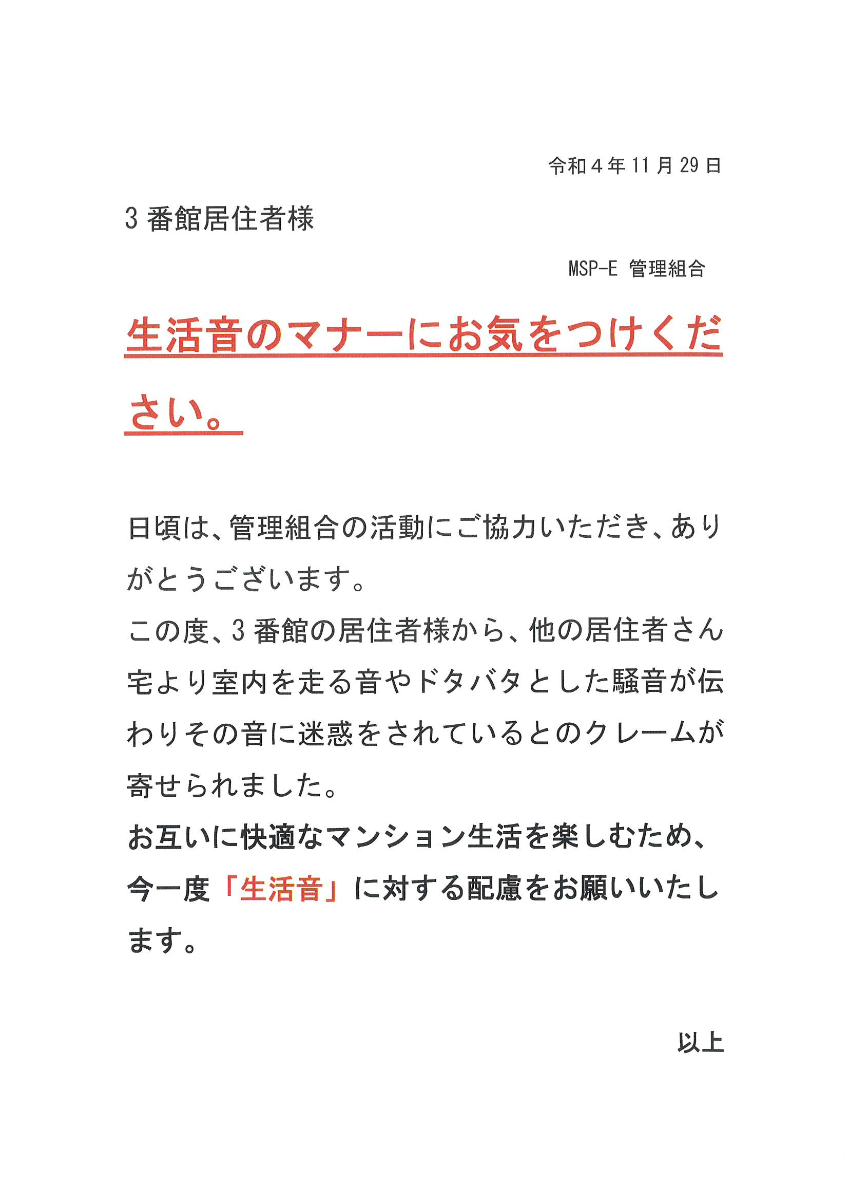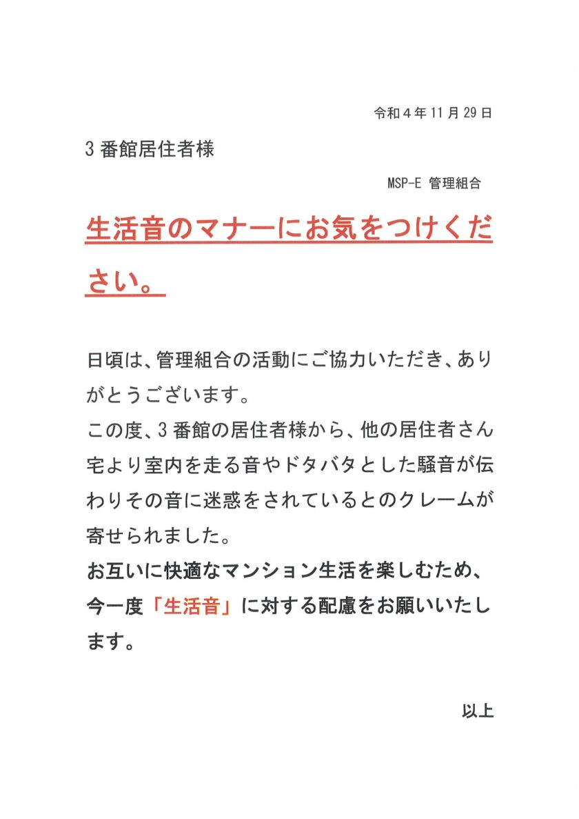 生活音のマナーにお気をつけください