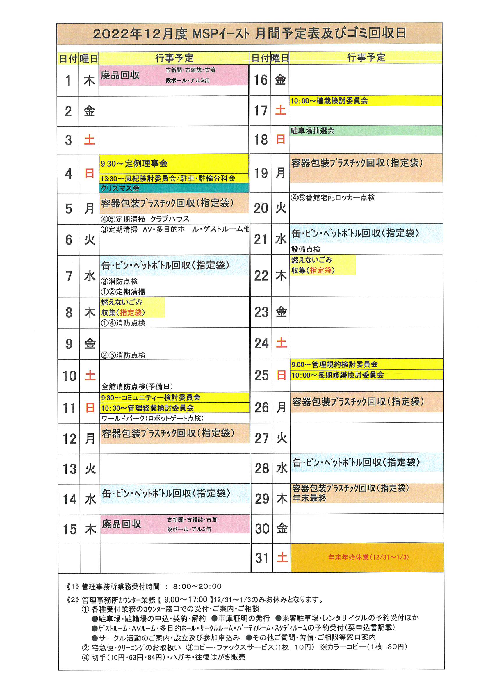 2022年12月度MSP-E月間予定表及びゴミ回収日(12/29修正有)