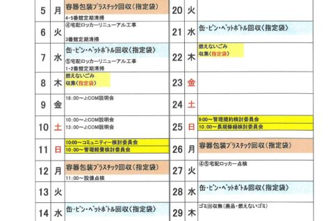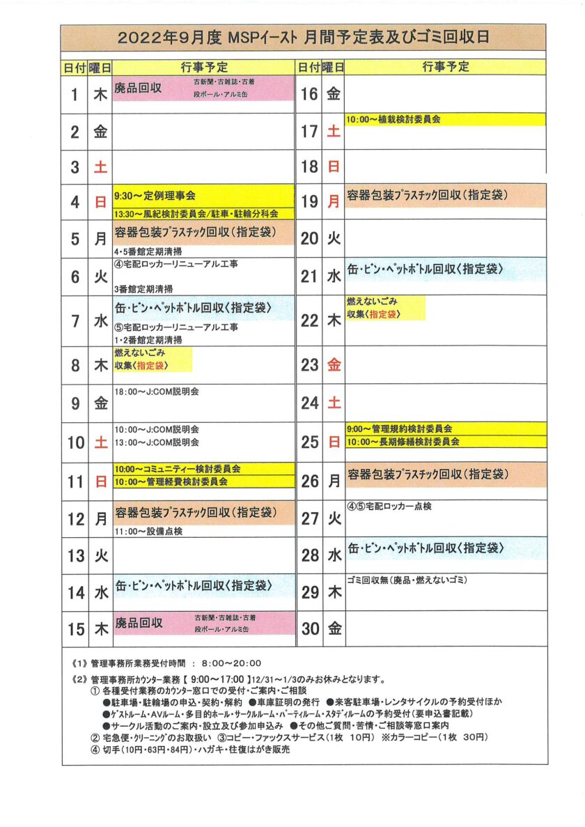 2022年9月度MSP-E月間予定表及びゴミ回収日