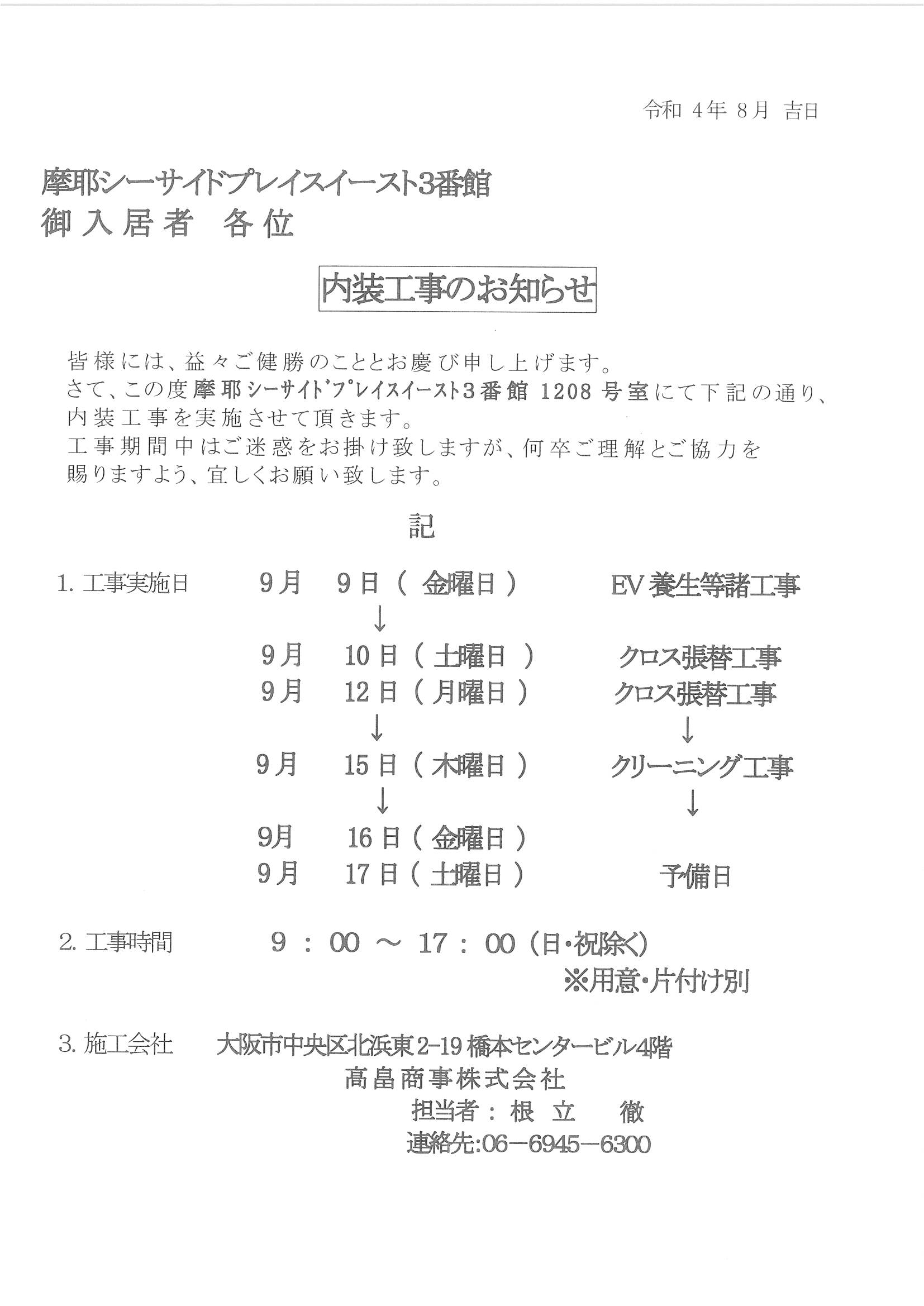 [3番館]リフォーム工事のお知らせ
