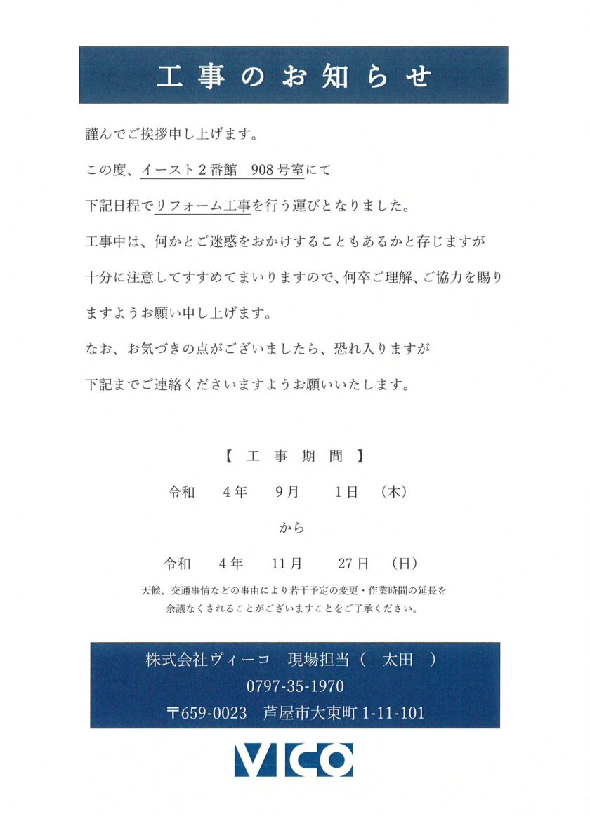 [2番館]リフォーム工事のお知らせ