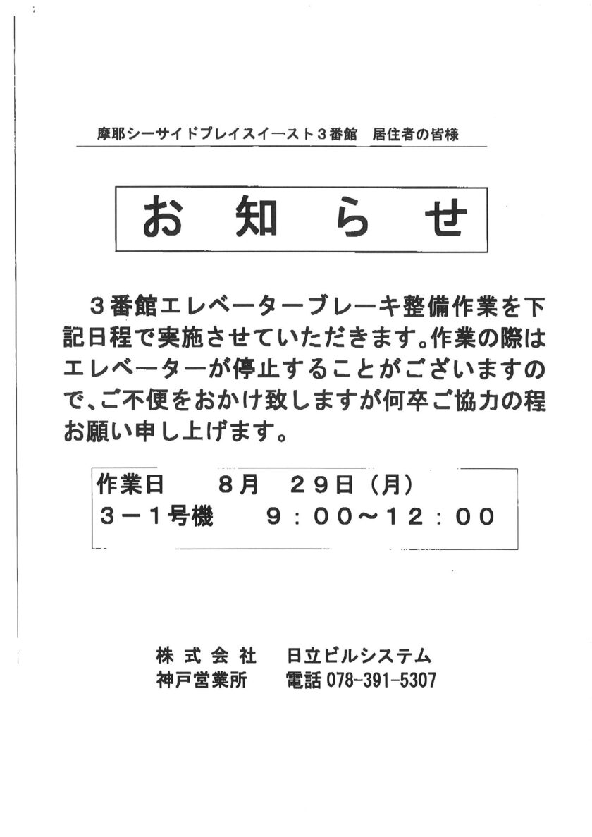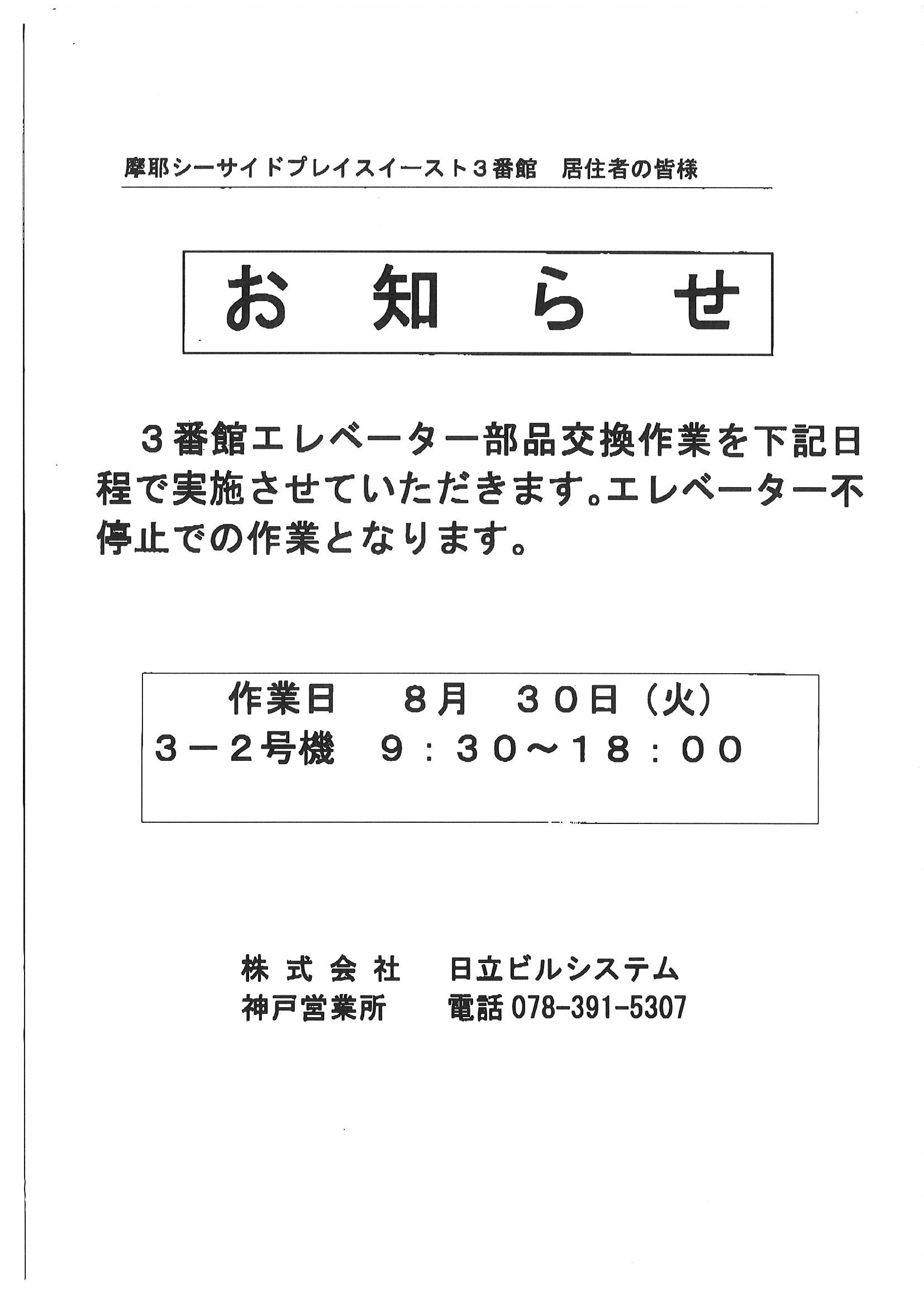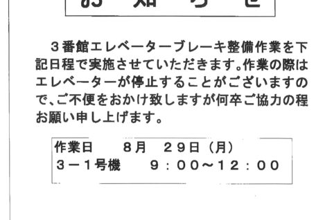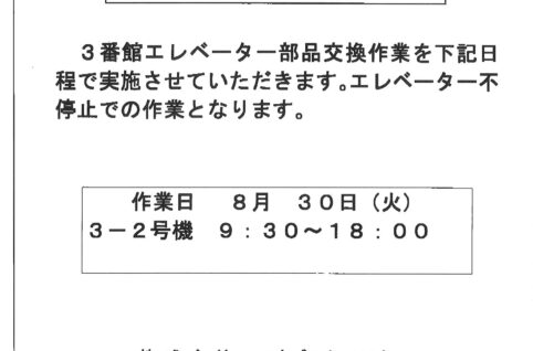 3番館エレベーター3-2号機部品交換作業のお知らせ